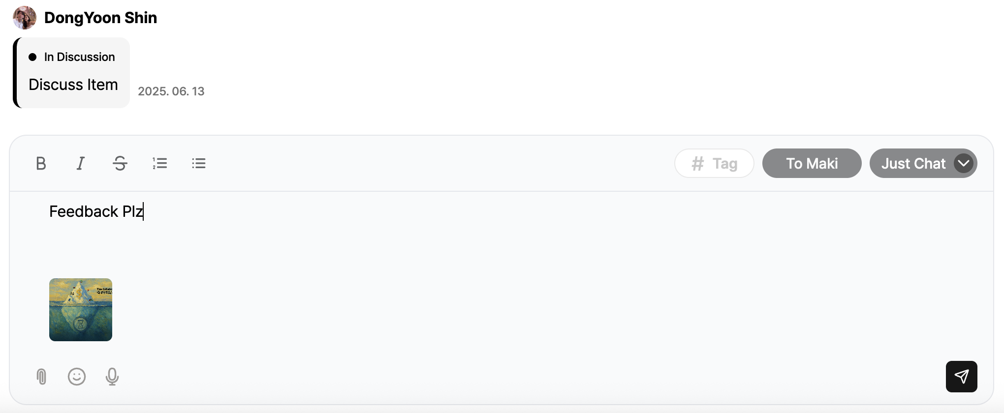 Click the attachment icon in the chat—or just copy-and-paste (Ctrl +C / Ctrl + V) the file to upload it.